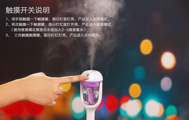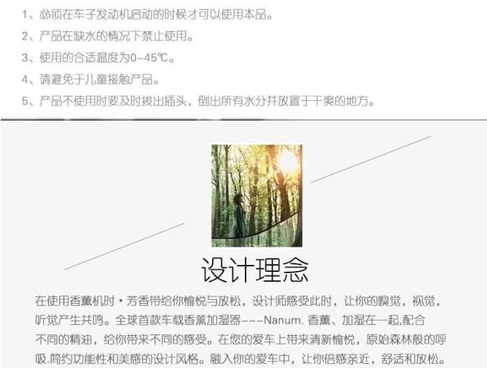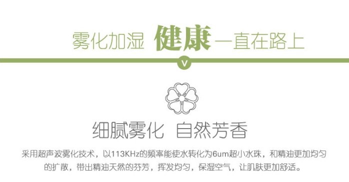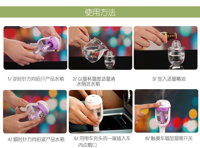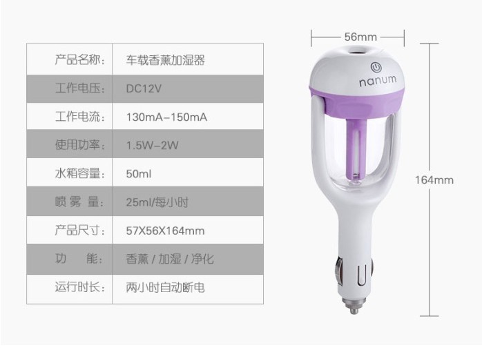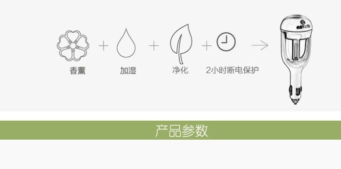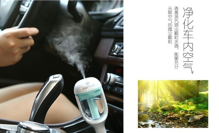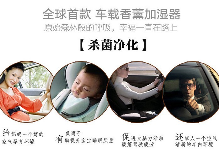 具备加湿功用和香薰机能。细雾可以扫除静电,减小电子电子元件的辐射,缩减汽车空气中粉尘和甲醇等有害气体的污染;对人的双眼和肌肤有保护功用;淡淡的花香可以舒缓心态,放松精神上并有助于新陈代谢。