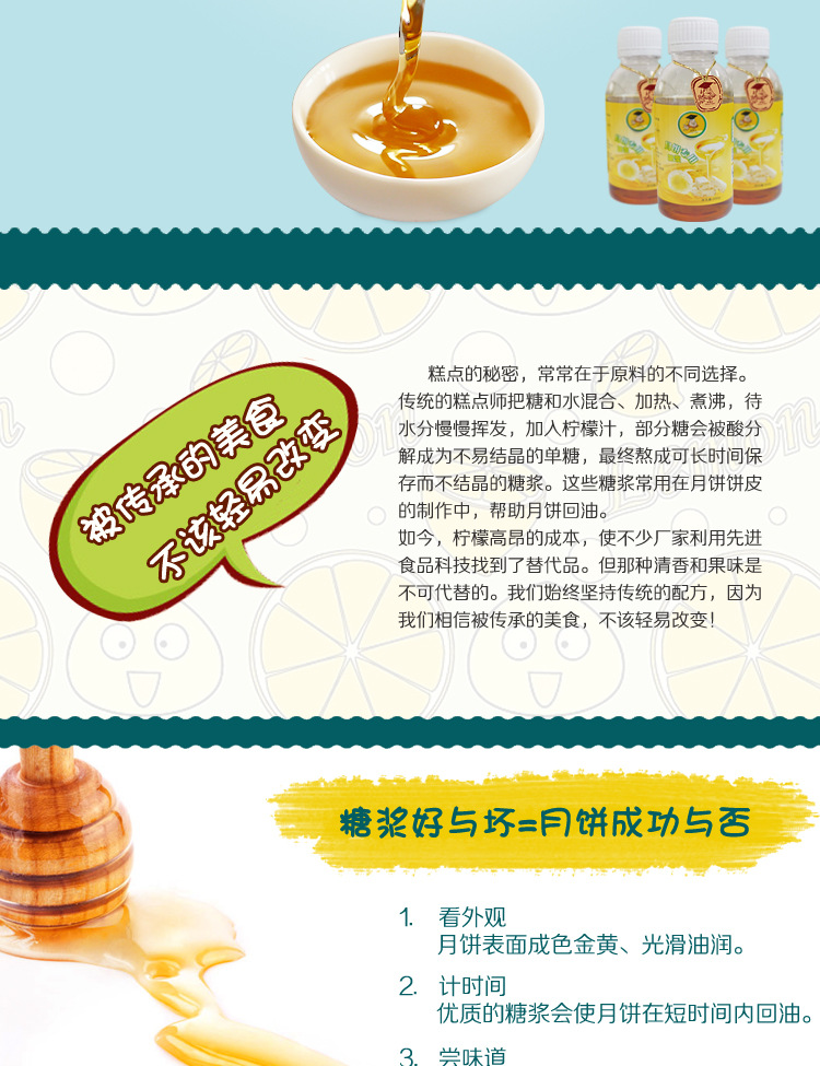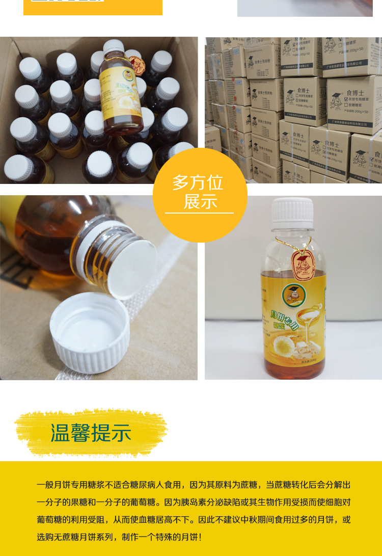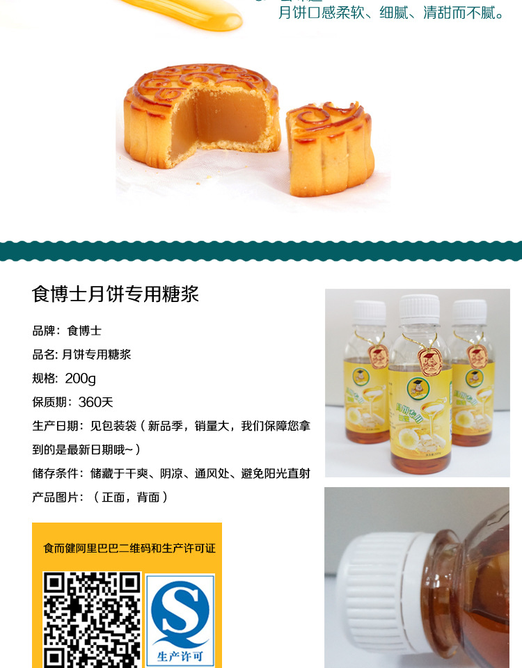 2.施博士的无蔗糖糖浆不含人造色素或调味剂,其稳定性极高,质地粘稠,香味清爽,不易晶体。用以制作各种高,中,高糖度食品。低档月饼,diy制作也很适宜。