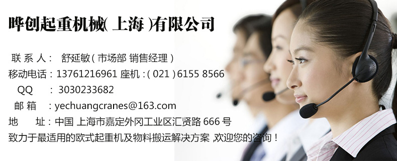 晔创起重机械(上海)有限公司是世界遥遥领先的起重机和物料搬运产品的专业制造商和服务提供商,致力于起重机和物料搬运技术的开发和研究,并且是高端专用装置的制造商。采用新思路,开发新产品,不停追求工业进步。公司凭借充沛的经验和专业的设计,为客户提供重量轻,净空低,安全准确,性能优良,运行高效的各种工况起重机产品,使客户减小了厂房投资。,提高生产效率,减小日常生活维护,节约运营能耗,得到良好的投资回报。