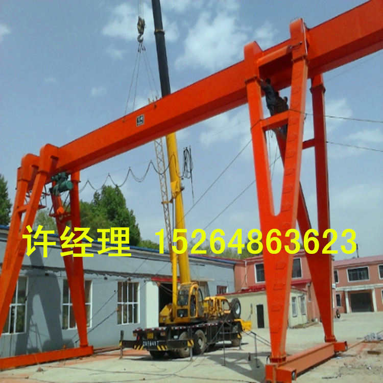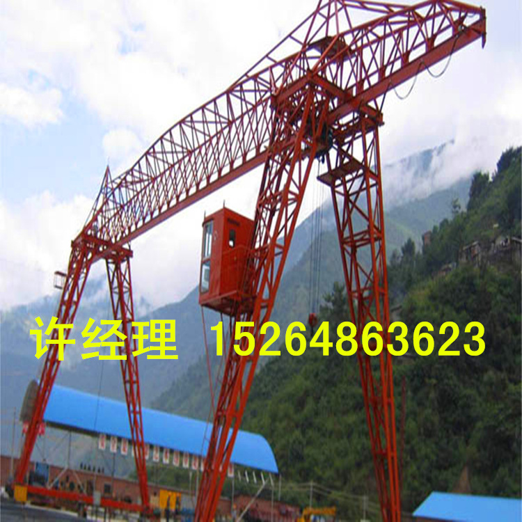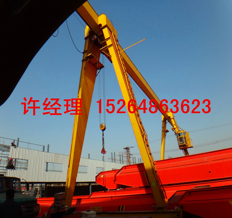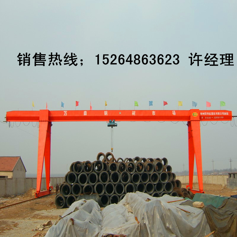 产品详情:门式起重机是桥式起重机的变体,也称做龙门吊。主要用以室外货场,堆场货物,散货装卸操作,其金属构造像门形框架,在下面安装了两个支撑脚可以直接在地面轨道上走动的远光灯。主梁的两端都可以有支腿。龙门起重机具有场地利用率高,工作范围大,适应性广,通用性强的特性,普遍用以港湾货场。