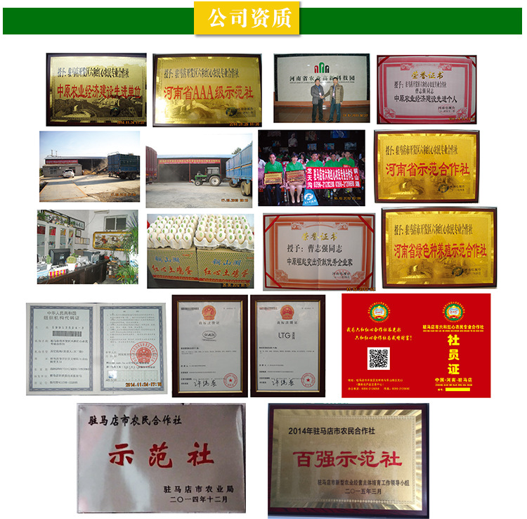产品详情:驻马店开发区六和红心农民专业合作社成立于2011年,注册资本为1200万人民币,并保有两个主要商标“铜山湖”和“龙天沟”。公司已通过国家认证。经过公司全体成员的多年奋斗,公司先后获取董事长“驻马店市模型合作社”,“驻马店市百强示范社”,“河南省示范合作社”和“河南绿植养养生合作社”。董事会获取河南电视台颁发的“中原rise卓越功绩卓越企业家”证书,2014年荣膺“河南省aaa级示范合作社”,“中原农业经济建设先进单位”等荣誉,“河南省百强优异示范合作社”等荣誉。在2015年曾是中华人民共和国商务部。商务部国际商报社,诚信兴商宣传委员会被评为“诚信和业务机构”。2015年,订单总额超过1.2亿元。驿城区顺和乡分社,驿城区朱古洞乡分社,驿城区故城乡分社,驿城区水屯乡分社,驿城区老河乡分社,驿城区沙河店乡分社,驿城区诸市乡分社,遂平县分社,汝南县分社,上蔡县分社,西平县分社,泌阳县分社,确山县分社,现有泌阳县盘古山耕种基地,泌阳县铜山湖耕种基地,驿城区金顶山耕种基地,确山县薄山湖耕种基地,西平县老王坡耕种基地,遂平县玉山耕种基地,汝南县宿鸭湖耕种基地,驻马店市新绿苗圃养殖基地。长年对外销售:各种果树,绿树,猪,白羽肉鸡,麻鸡,三黄鸡,柴鸡,一般而言商品蛋,土鸡蛋,柴鸡蛋,stocking鲜鸭蛋,咸鸭蛋,可食用真菌,香菇,红薯粉条和其他产品。我们大量销售优质小麦和优质玉米,并欢迎来自大型矿山和大型农场的朋友加入并合作。我公司始终在云天国际化工集团(全国电话计费行业的前100家企业),鲁西化工集团,金正大国际。双汇集团(活猪养殖),六和集团(契约肉鸡,鸭,蛋鸡养殖),一加一个面条行业(订单玉米种植),中国邮政储蓄银行(赞同农业信贷),泰国正大集团(订单小麦种植),河南牧鹤集团,加拿大沃尔德(国际)作物有限公司等,大型的国有企业和跨国公司成立了不错的合作关系,而且,从未nz@@@的会员保证,就实现了生产,供应和销售的一站式服务,会员可以免费用到合作商标。会员集体购得饲料,兽药,种子,化肥,农膜等农产品及用品。全年有6名国家级基本农业技术人员为会员提供免费的技术指导服务,以保证会员能够成功种植和繁殖。