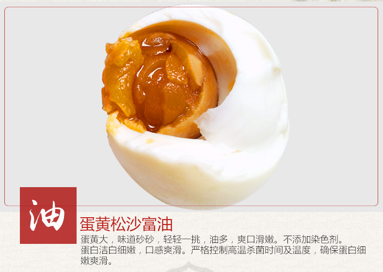 使用传统配方和现代技术精制而成,蛋壳为白色或浅绿色,破碎后的蛋清为白色,蛋黄为金色,黄色和红色
