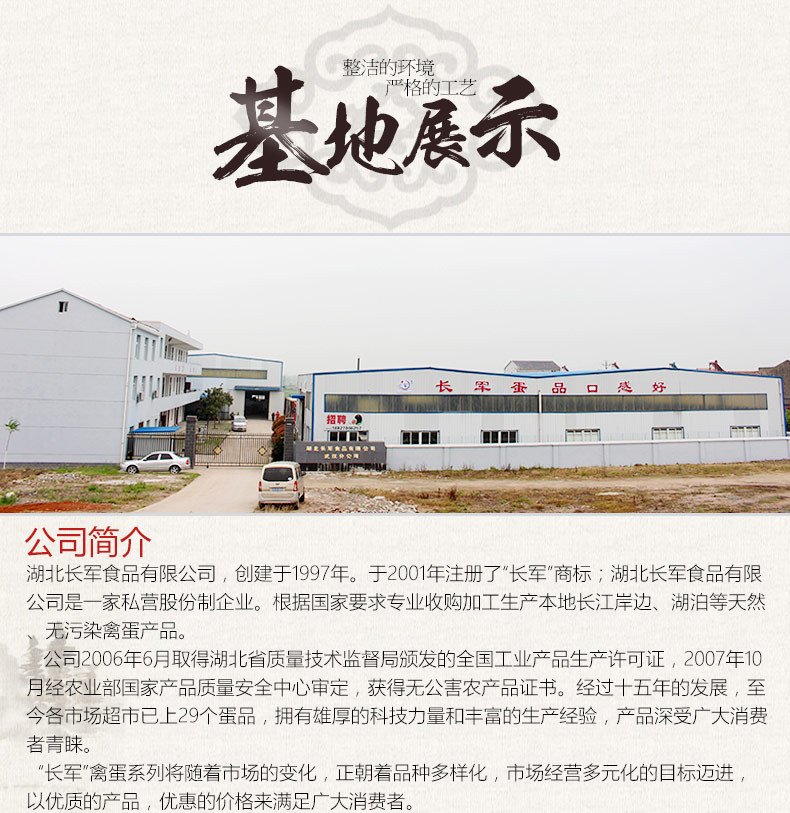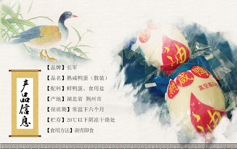 长军牌咸鸭蛋精选地方长江岸边,湖水,稻田和其他自然无污染的鸭卵,严苛按照国家(企业)规范生产要求