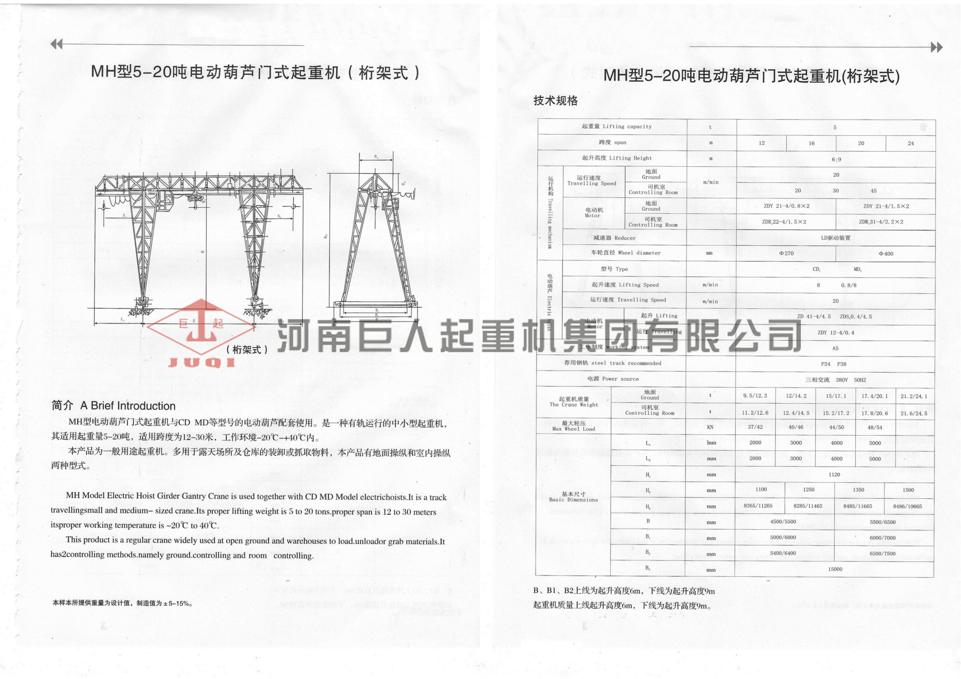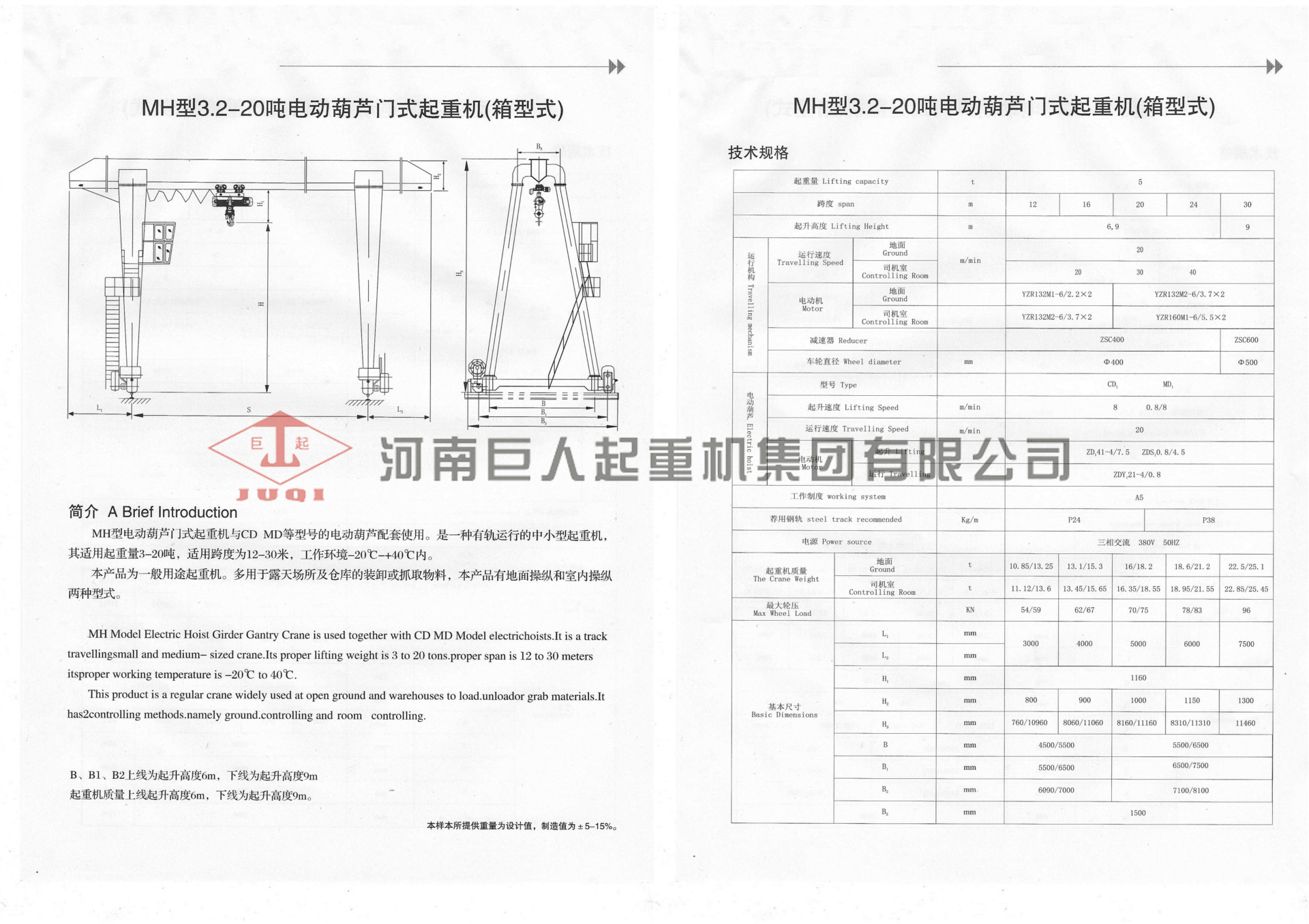 - 大车运行速度20 (m/min)