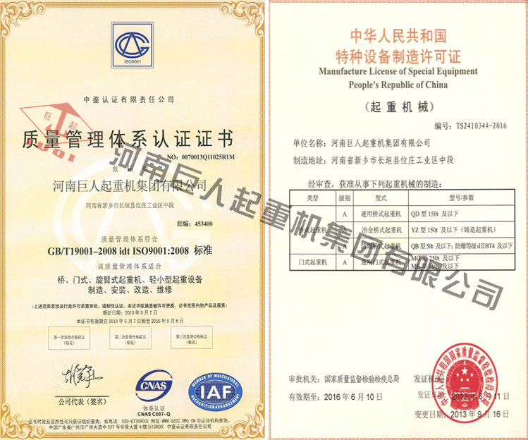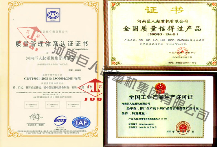 河南巨人起重机集团有限公司是中国最著名的起重机制造商之一。中国重型机械工协会memberunit,主要产品包括“juqi”牌cd,BCD,BMD系列0.25-17.2吨电动葫芦,HC,HCM系列0.5-80吨电动葫芦,ZHD,ZMHD系列小于10t冶金电动葫芦;单,双梁桥式门式起重机系列产品的各种型号和标准;装卸桥,绝缘,防爆,冶金,电磁起重机及抓斗等系列产品。