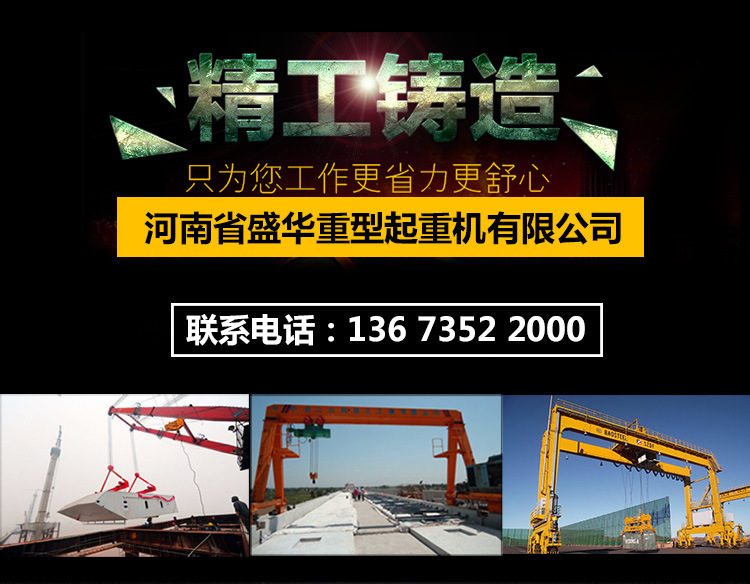 河南省盛华重型起重机集团是一家集研发,制造和销售为一体的现代化企业,主要从事:龙门吊,桥架机,铁路桥架机,轻轨桥架机,提梁机,移动模具架(造桥机),造船龙门,钢箱梁和钢桥的制造和研发。合约设备租赁,桥架设劳务分包,钢箱梁安装,设备转让,设备维护和改造,工程建设分包,梁提升,梁运输,梁安装工程的工程承包及相关技术服务。