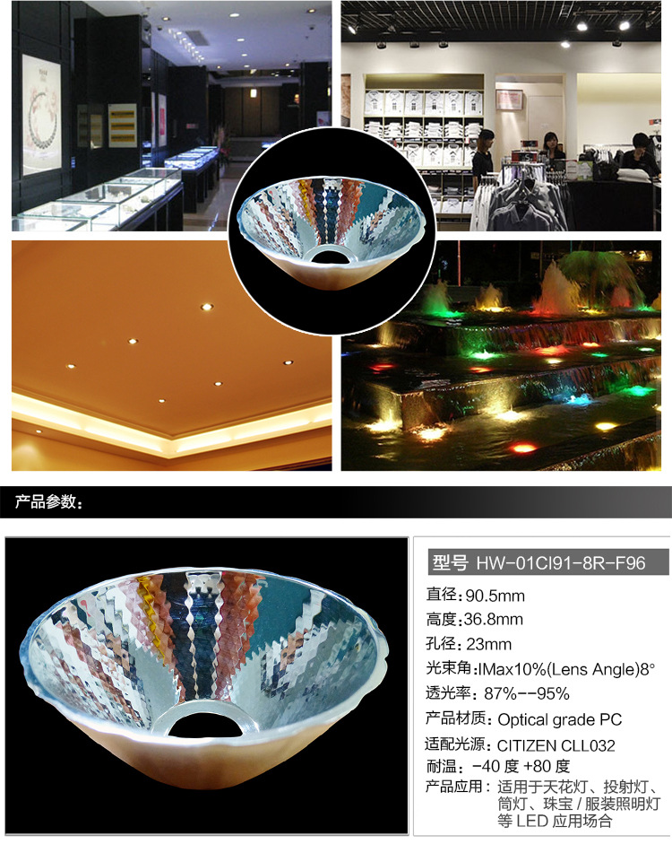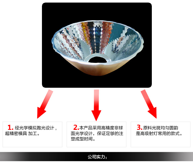 公司已推出路灯透镜,隧道灯透镜,工矿灯lens,泛光燈lens,舞台照明透镜,广告牌透镜,聚光灯透镜,MR16透鏡,Par30lens,AR111透镜,Par38lens,手电筒透镜,烛光透镜,酒柜和厨柜灯透镜,服饰首饰照明透镜,红外防伪透镜,凸透镜,COB透镜,混合光透镜以及特种军事,医疗照明等透镜,可以准确地达到各种出发点和光种类要求,以实现最高的光效率和最佳的照明效用。