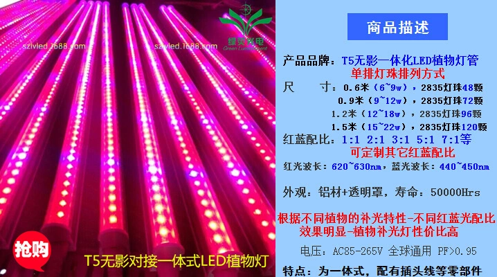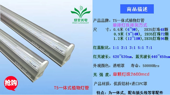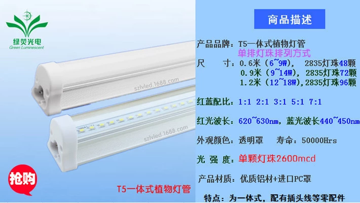 T5集成式led植物灯:2835方案单排灯珠,0.6m6〜9w/0.9m9〜14w/1.2m12〜18w