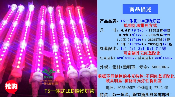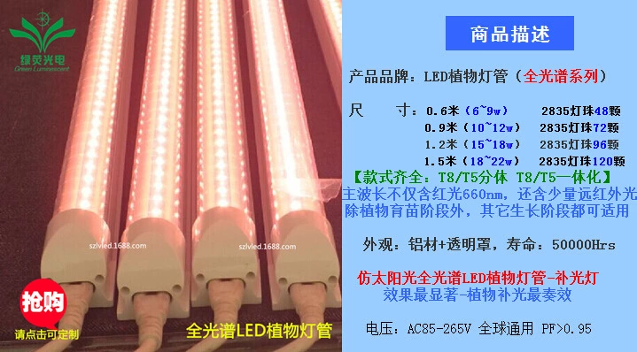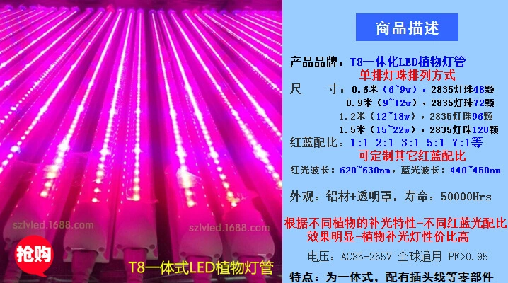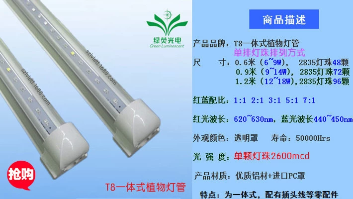 T8集成式led植物灯:2835方案单排灯珠,0.6m6〜9w/0.9m9〜14w/1.2m12〜18w