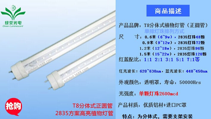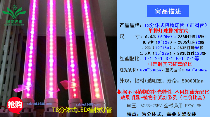 T8分体式led植物灯:2835方案单排灯珠,0.6米6〜9w/0.9米9〜14w/1.2米12〜18w