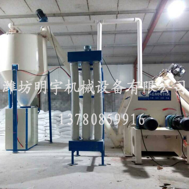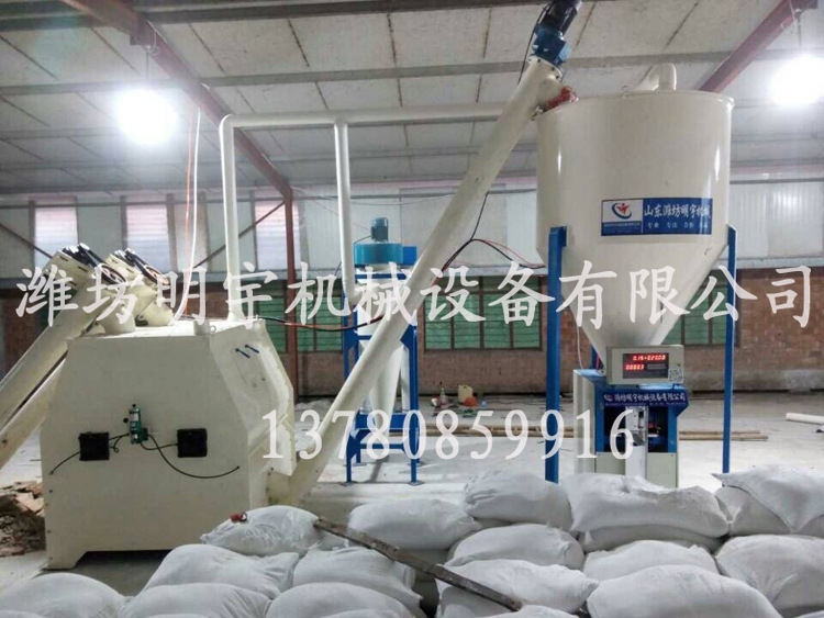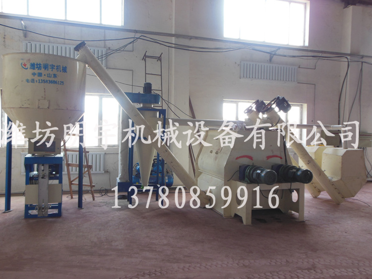 设备主要由进料斗,螺旋上料机,卧式不带重力搅拌机,成品输送机,成品仓库,自动称重包装机,电控箱,除尘器(选配)构成。