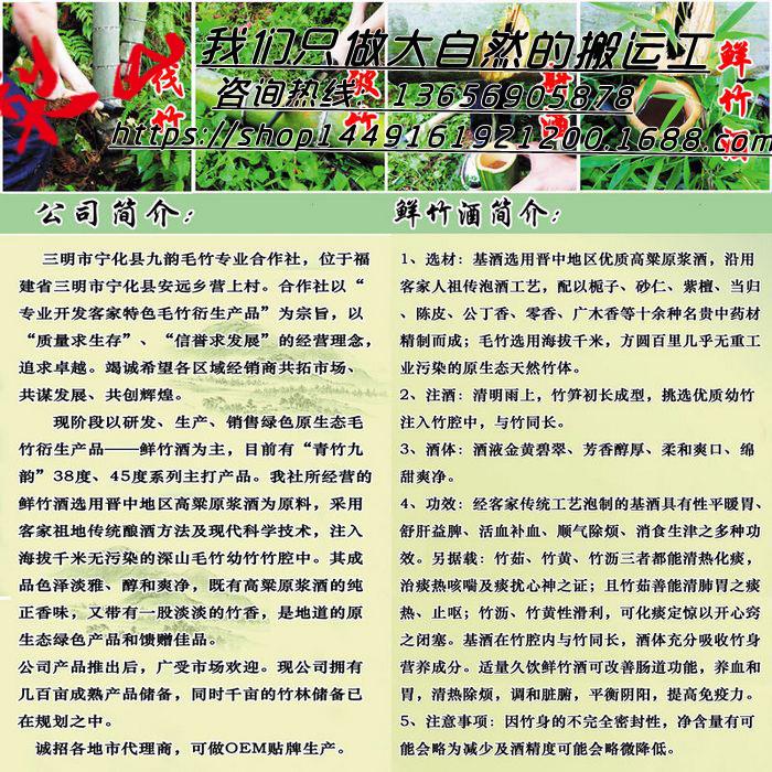 在竹苗的早期生长阶段,将精酿之高粱酒流入该酒的竹腔中。将酒与竹节中分泌的液汁结合在一起,经过最少30个月的混合和浸入后,将竹子的营养和甜充分溶解到酒中,从而可以吸收竹子的营养,从而保持健康饮酒时的躯体竹子的功能简介如下:竹茹:性肺热咳嗽淡,微凉,具有清热解毒,祛痰消郁的效用。在临床上,它通常用于治疗镇惊利窍,发烧和呕吐,心,失眠,化痰中风,强舌,胃热和呕吐,妊娠抵抗,胚胎功能阻碍等。朱丽:性竹黄寒,可以扫除加热并减小痰,天竺黄。竹沥在临床上通常用于治疗病症,例如中风,高烧,肺炎,癫痫和支气管炎。现在我们可以轻松地从药铺购得助力口服液。癫痫:通常叫做小儿惊风。它的特性和味道既甜又凉,具有清热化痰,凉血降压的功能。“本草求真”涵盖:“与竹韭菜的功能相像,两者都可以排出痰液,并利于孔口,但这可以使心脏凉风通热,对身患癫痫,风热,痰和失语症的儿童开展治疗。竹韭菜,它的性别,并且从未感冒和滑的高风险。”它在临床上通常用于治疗发烧,痰,中风,味甘,竹笋抽动症等。竹叶:性冷,味甜淡淡,具有清热,扫除苦恼和利尿的功用。“圣惠方”中介绍了用竹叶制成的粥可以康复儿童的'。临床上,它通常用于治疗习惯性便秘,高血压,痔疮和心脏灼热引起的舌疮。竹笋:它不仅是美味佳肴,而且是具有精确疗效的中药材。唐代知名医师孙思邈“千金要方”写道:“味甘味甘,特性稍冷,无毒,主要减轻口渴,减小水份,提高生命力,可长期食用”。李时珍在“本草纲目”中将竹笋的功能总结为:治渴,调水,补气,祛痰,健胃。因此,竹笋特别适合糖尿病患儿。此外,竹笋富含大量的膳食纤维,可以有效性提高胃肠蠕动,适合便秘的人。品尝优质葡萄酒时,可维持健康。我可以用一块石块杀两只鸟。我不仅生产葡萄酒,而且还产生更多的良心。我们不生产低廉的产品。我们旨在制作竹酒行业优异品牌。