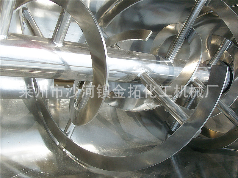 卧式螺带混合器的传动主轴上装有双层螺旋叶子。内部螺旋将物料输送到外部,外部螺旋将物料搜集到内部。在双层螺旋带的对流运动下,物料形成了低功率,高效的混合环境。安装在混合轴上的外径螺旋带动料筒中的物料,从而使搅拌器将料筒中的物料最大程度地旋转。混合设备工作时,内部螺旋带动物料在轴附近成为轴旋转,轴向从内侧推向两侧,而外部螺旋带动筒壁附近的物料旋转,轴向从两侧推向内侧。能够在短时间内均匀混合。