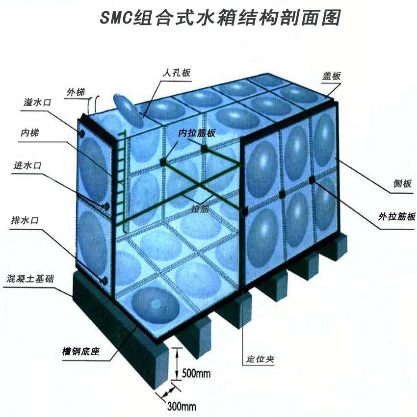 我公司现主要生产各种系列的水箱,这些水箱全部由优质提高材料制成,并通过高温高压技术成型,并制成不同规格(1m×1m,1m×0.5m,0.5m×0.5m)。组装前的厚度(6mm,8mm,10mm,12mm,14mm,16mm)。以下相关参数是根据“建筑物给排水设计标准化”(GBJ15—88)设计的,并且已确定该系列产品的保健指标由北京市保健和防疫机构提供,并且全部达到“生活饮用水保健规范”GB5749-85。华盛SMC。该水箱的特点是重量轻,不生锈,不泄漏,水质好,水宽使用范围广,使用寿命长,保温性能好,外形美观,安装简便,清洁维护简便,适应性强,是公共生活,消防用水和工业用水设备的完美产品。