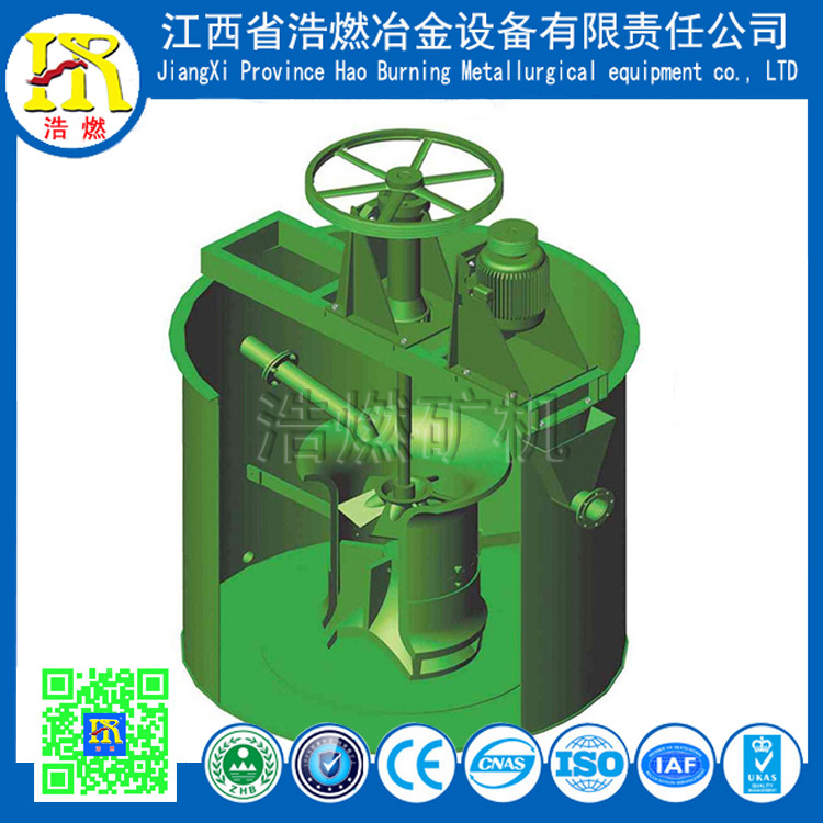 该混合罐用于在浮选操作之前将浆料混合,从而使浆料和试剂充分混合,并且还可以用于混合其他非金属矿物。为选矿作业创造条件,形式为平底桶,辐射循环辊,旋转叶轮和机器搅拌。