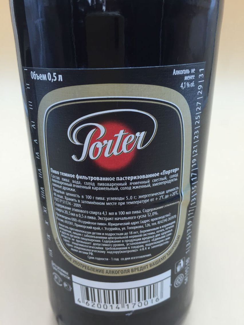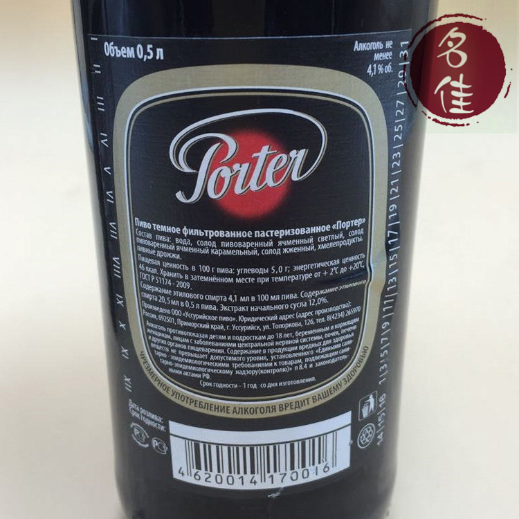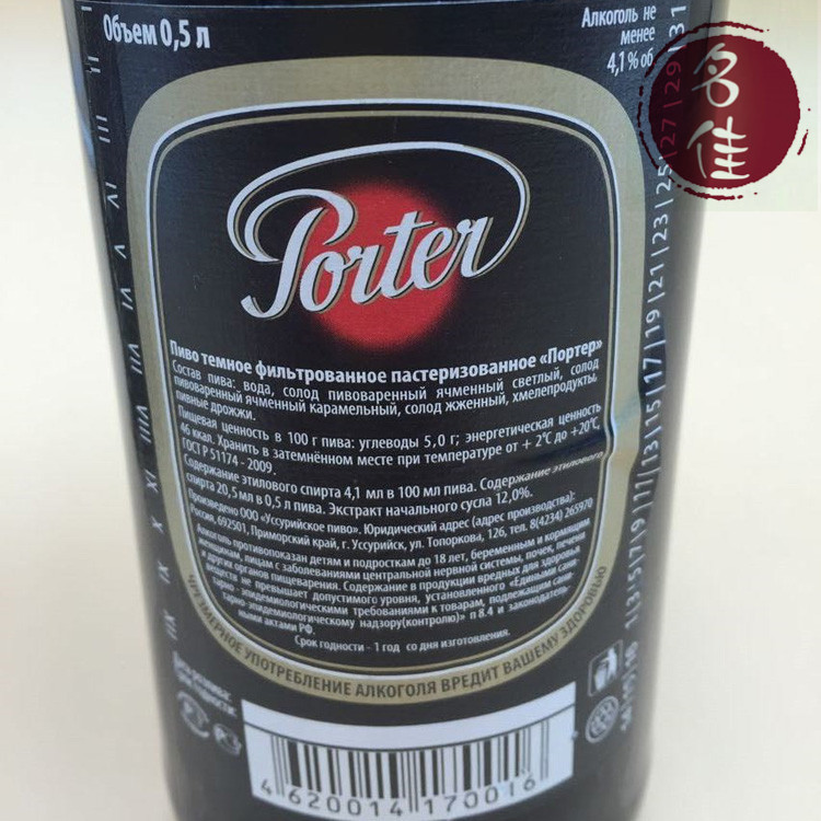 俄罗斯原进口波特啤酒,采用现代技术制造,相符德国啤酒的质量,乙醇含量4.1%,提取含量12%,能量值46卡路里/100g,不含食品添加剂,来自天然产品制造。