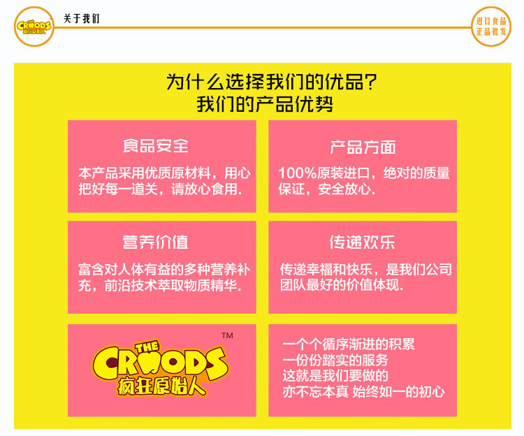 crazyprimitivecompany充当代理商,在全世界各地经营一系列知名的顶级食品。目前,它保有来自世上几十个国家和地区的数千种名牌食品和特色食品,并已成为华南地区有名的进口食品经营者,我们的产品遮盖国内许多知名商贸商店,并且有许多国内优质的分销渠道。公司将结合在线和离线O2O的运营模式,为您提供全世界一流的食品和优质服务。
