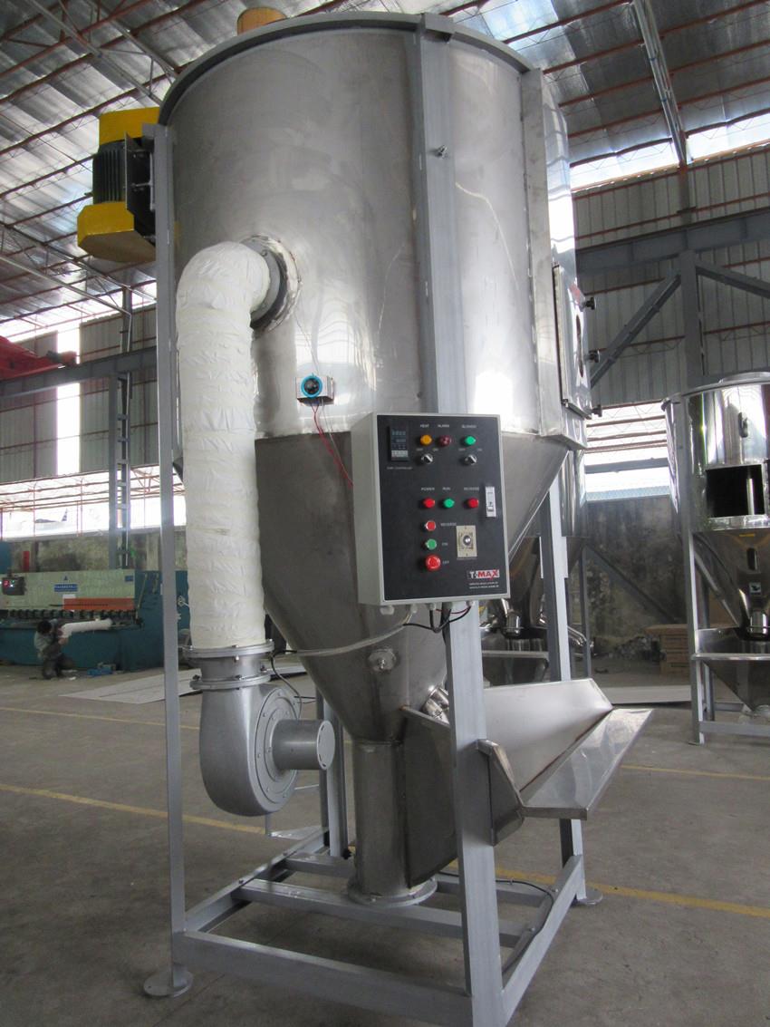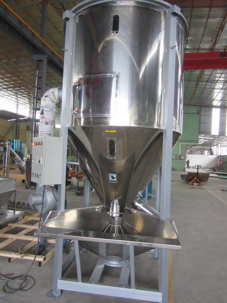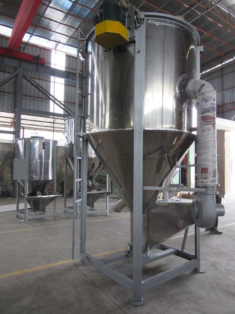 2吨不锈钢干燥立式混合机主要用以混合和干燥各种颜色的塑料颗粒,是注塑机和造粒机的必需装置之一。塑料颗粒从进料 斗进入并在螺旋叶片推动力的作用下沿叶片表面向上滑动。在上部离心力的作用下,它们向发条盒移动。抛开四周,零星的物料连续向下移动,并被螺旋叶片不断地从桶中的循环出口和循环出口提起,从而反复循环以达到混合的目的。空气通过鼓风机送至电加热箱。加热后,它变为热空气,然后由温度控制仪自动操纵。均匀且适宜的热空气从树脂颗粒始终纵贯材料层,并始终展开热交换。去除水分,树脂颗粒从上到下缓慢降低,连续吹扫干燥,完成高效的干燥混合过程。