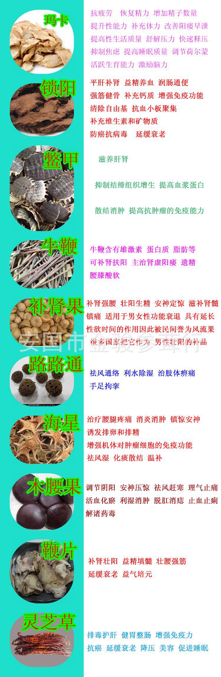 产品成份:玛卡锁阳补肾水果木腰果灵芝草牛鞭海星鞭片红花桑枝牡蛎伸筋草女贞子蔓荆子红藤甘草等。