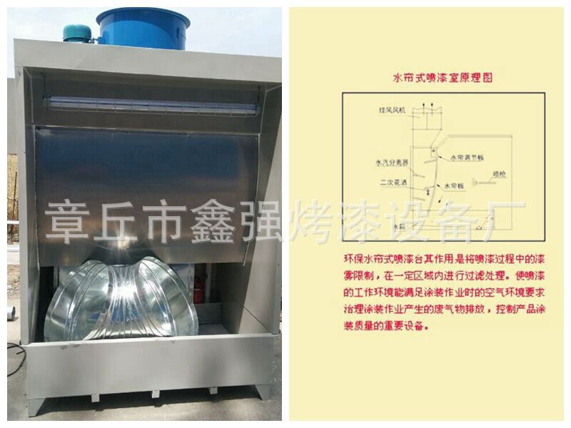 工作原理环保型水幕柜(喷漆架)主要由自吸水泵抽水,使水在水幕板上周而复始均匀流下。喷枪喷出的废气(漆雾)被水幕板上的水碰撞到下面的水池中,一小部分的废气(漆雾)通过上方的排气管从车间排出。风扇。车间并未废气(油漆雾),为每个人提供了不错的工作环境。