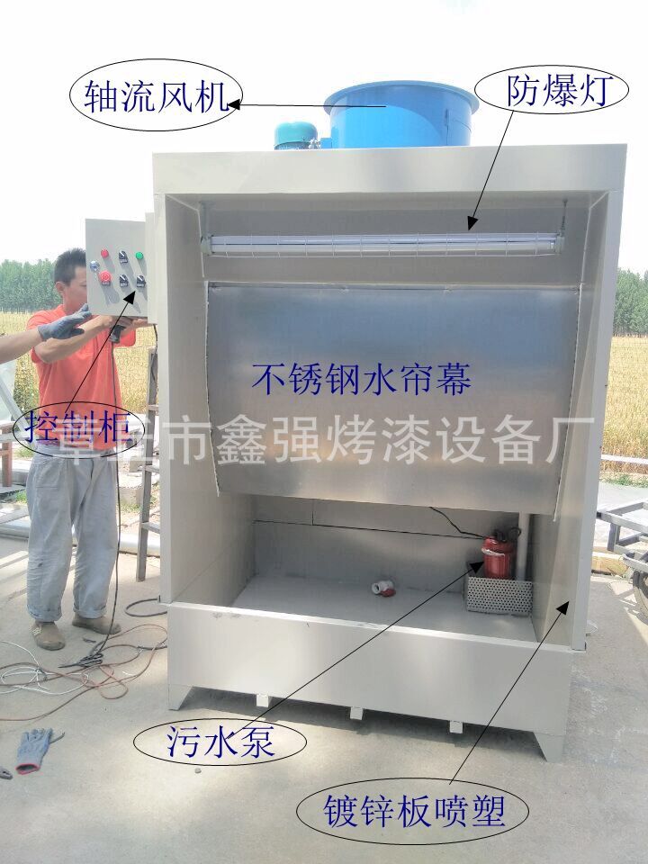 水幕柜的特征是,它可以在喷涂过程中直接碰撞池或水幕的表面上残余的油漆粉末,并且通过多层过滤器过滤掉喷涂过程中产生的味道和少量未吸附的油漆粉末。一层水帘并排到排风扇。在喷涂间外,它起到净化喷涂工作环境并保障个人身心健康的功用,并可以提高喷涂铸件的表面光洁度。