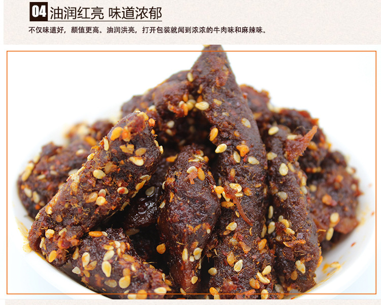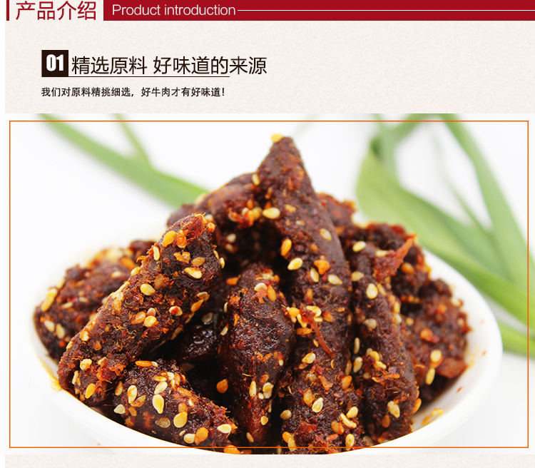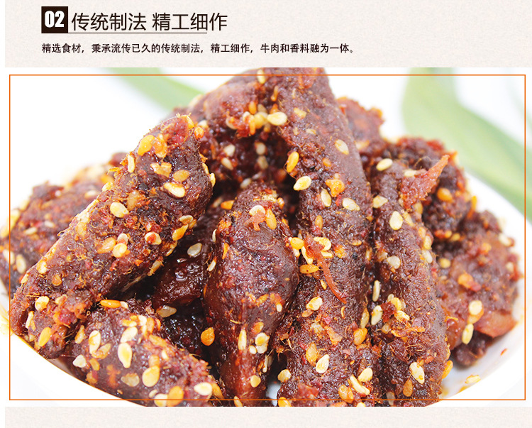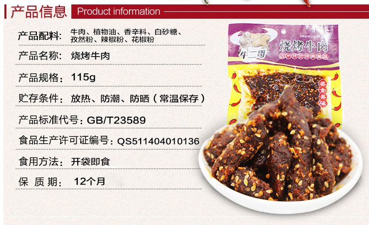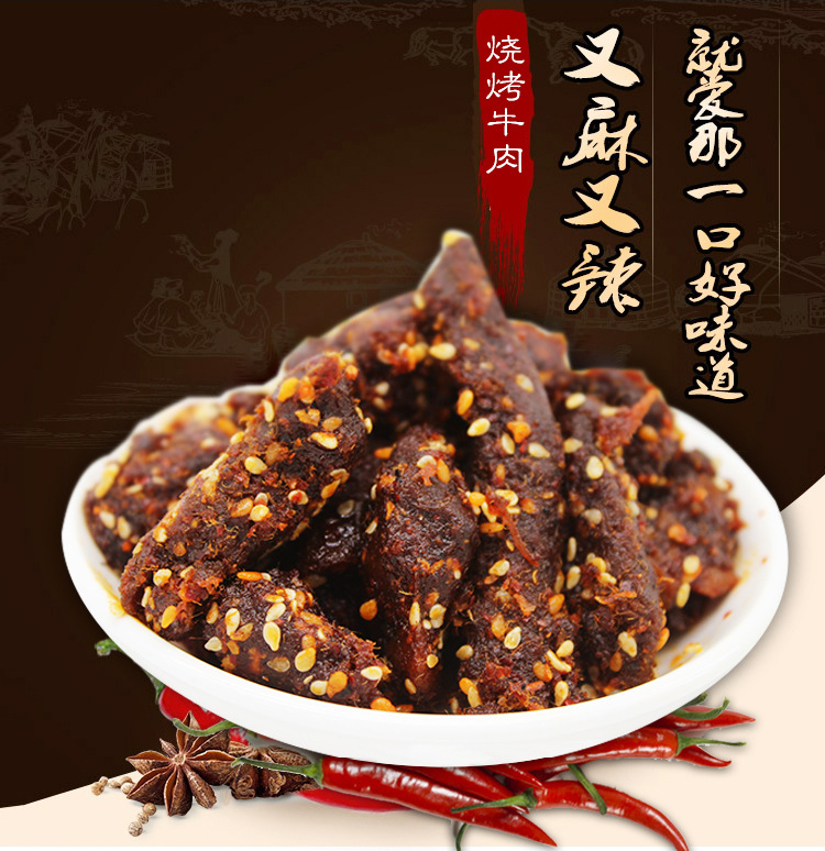 - 原料和配料牛肉、植物油、香辛料、白砂糖、孜然粉、辣椒粉、花椒粉
