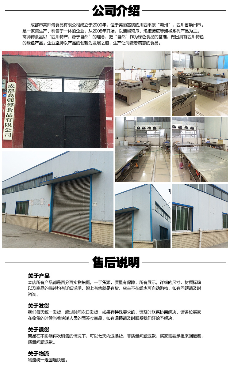 成都市高师傅食品有限公司成立于2000年,座落漂亮丰饶的川西平原“蜀州”,四川省崇州市。它是一家集生产和销售为一体的企业。自2008年以来,它主要专注于泡椒鸡爪系列产品,例如泡椒,泡椒猪皮。高世福食品以“源自自然的四川特产”的定义,以“自然”为绿色食品的基石,生产有着四川属性的绿色产品。该公司坚称产品创新作为其开发方式,并生产满足顾客需要的食品。