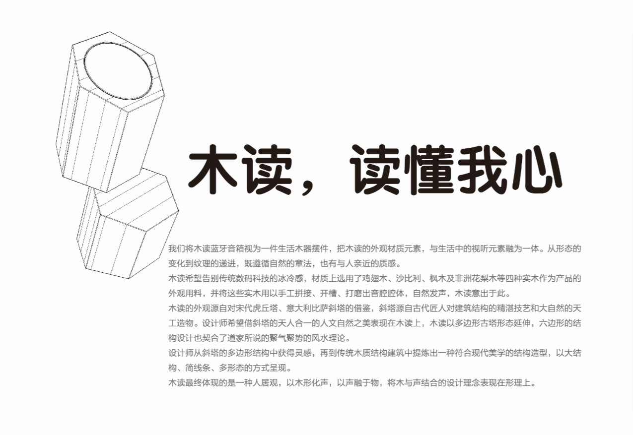 我们将木质阅读蓝牙喇叭视为生活中的木质饰品,并将木质阅读的外观和物质元素与生活中的视听元素融为一体在一起,从形状的变化到纹理的演进,不仅遵循自然的规章制度,但又有着接近人的质感。