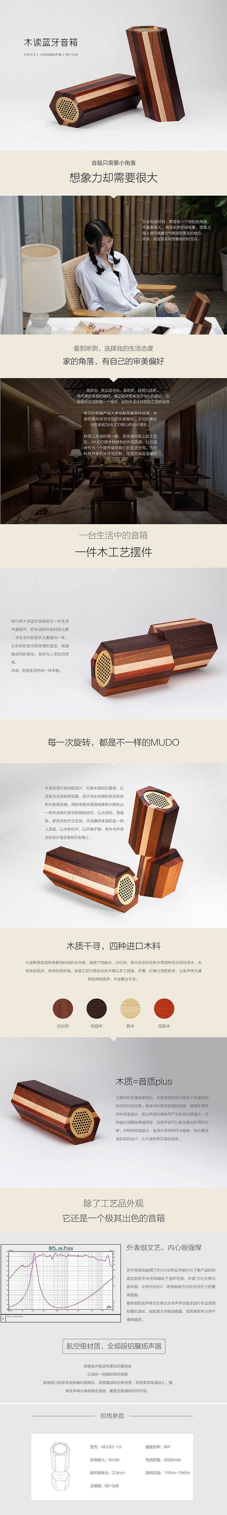 木读期望告别传统数字技术的漠不关心。选取了鸡翅木,沙比利,枫木和非洲花梨木这四种实木作为产品的外观材质,这些实木用以手工缝制,开槽和抛光音腔以产生自然的声音,木料的意思就是这个。