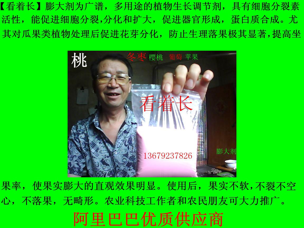产品详情:植物生长化学调控技术,又称植物生长调节剂,作为一种新型的农业生产实用技术,越发受到人们的关注。随着植物生长调节剂种类的不停增加,化学工业的飞速发展。控制技术大大增加了作物的使用种类和面积,他可以给农民朋友增加生产和收益,[增加30%-60%]。为了适于科学有助于农业发展的需技术和技术的推广以及新技术的推广,我们在多年的实验研究基本上,借鉴国内外的实验研究报告和成功的应用经验,成功开发了一种特别的植物生长调节剂。】,是目前的一种高科技尖端配方,采用后,果实品质极佳,颜色鲜艳,且有亮度。不柔软,不裂,不空心。可不遗余力推广。稀释倍数为:4000次----5000次