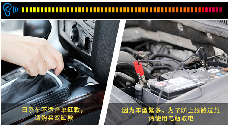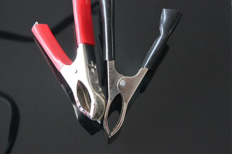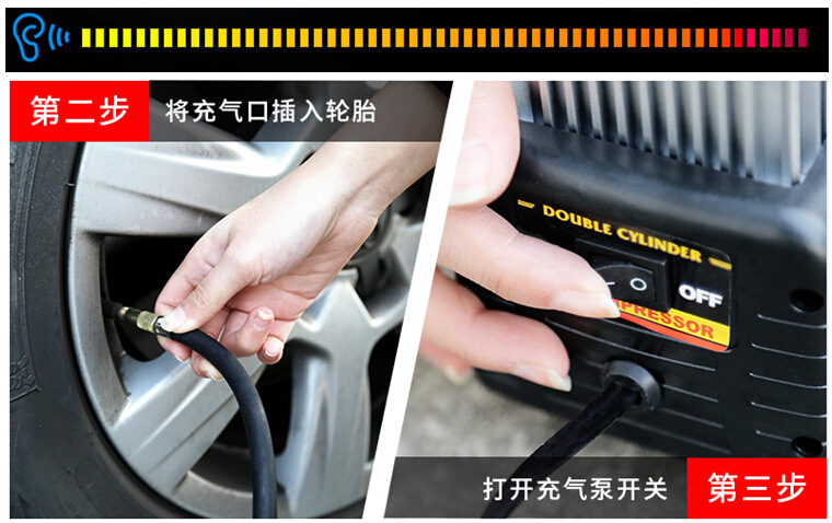 2.启动汽车引擎以增加功率。拔下插头,插入汽车点烟器,或按红色阳极和黑色阴极连接电池夹,开启气泵开关