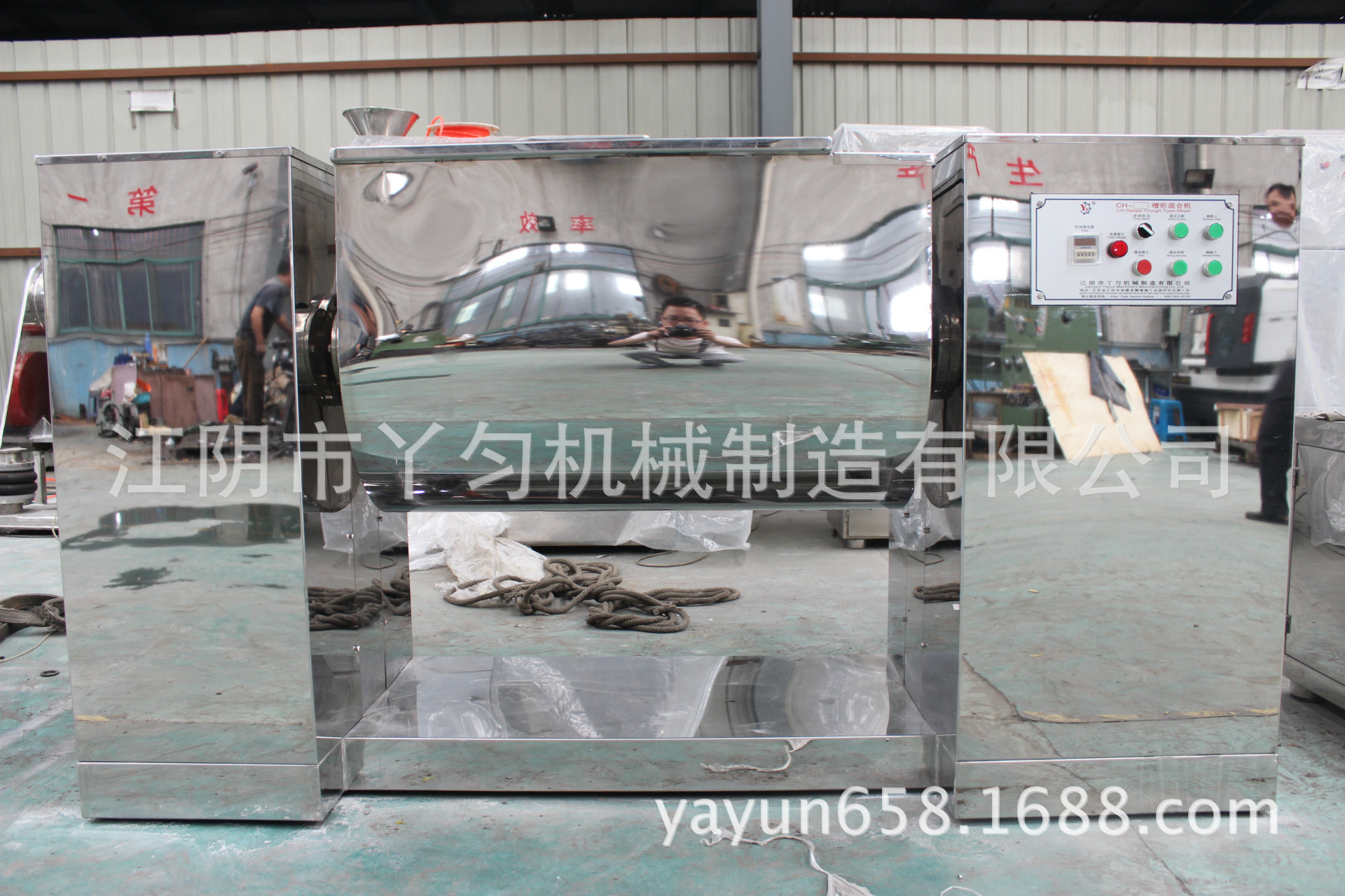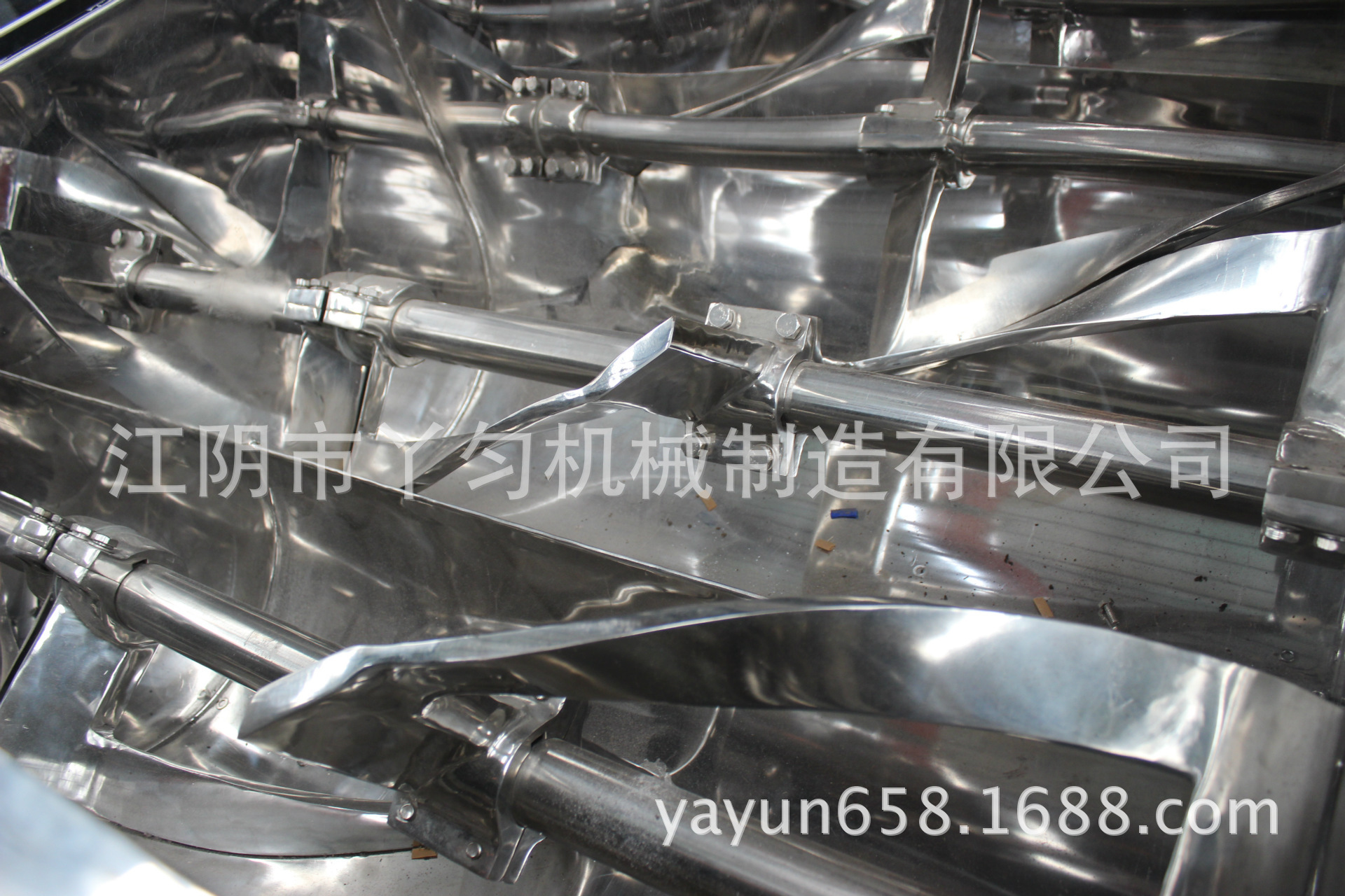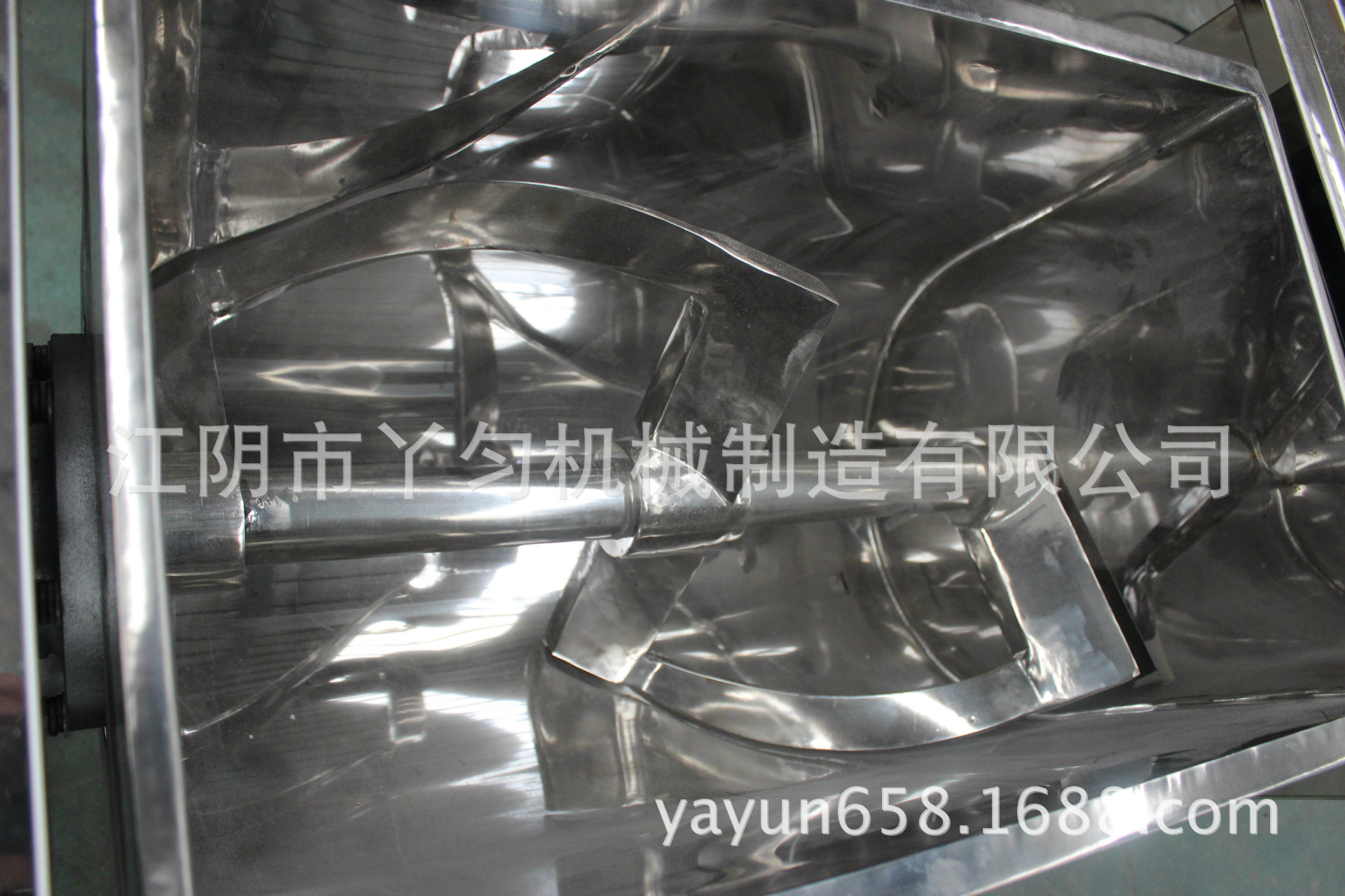 该机器是全不锈钢卧式槽混合机。它用以在制药,化学,食品和工业中混合粉末状或湿性或糊状材质。尝试将主辅料按不同百分比均匀混合,并且刀片和料筒之间的空隙较小。混合中从未死角,并且混合轴的两边都配有密封设备以预防物料流动。