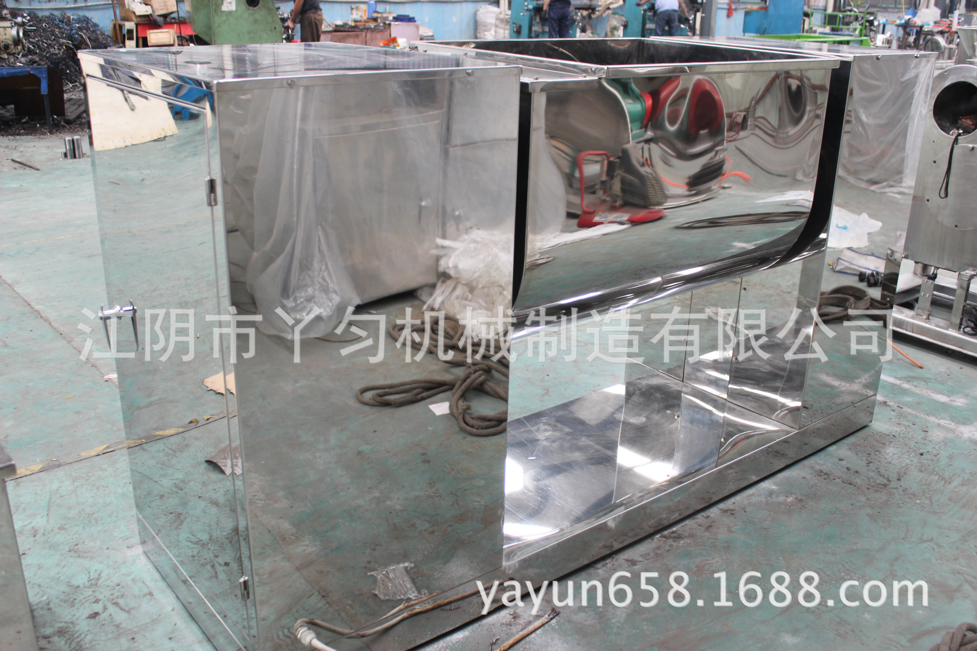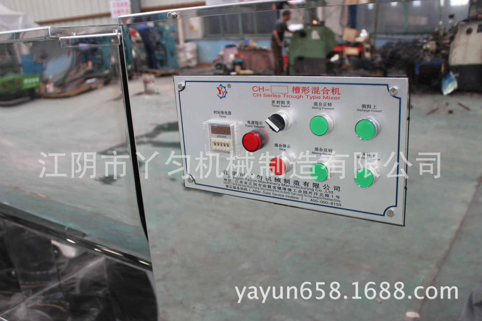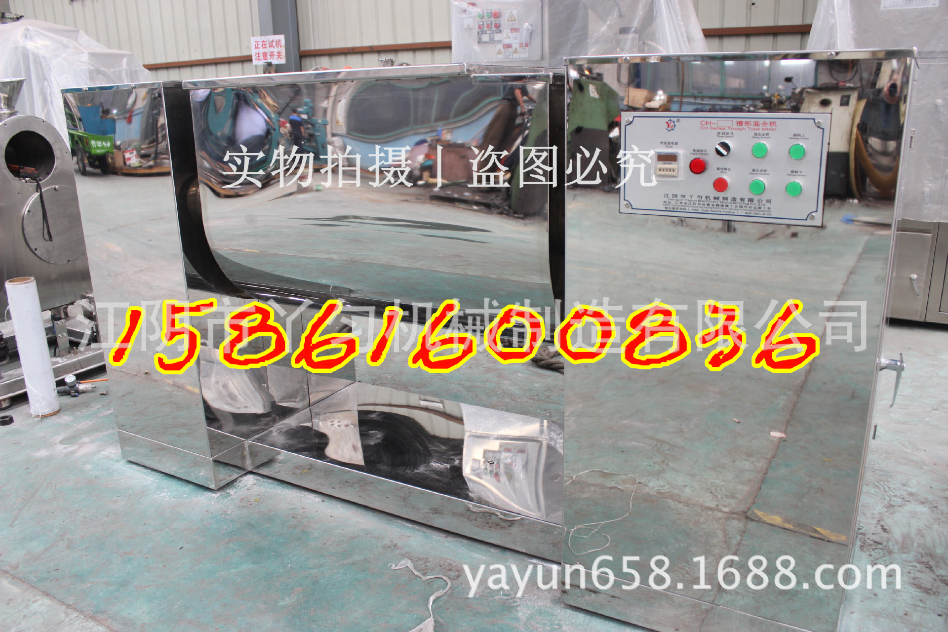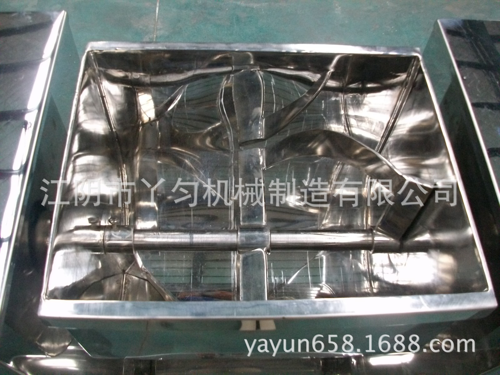 该机器是全不锈钢卧式槽混合机。它用以在制药,化学,食品和工业中混合粉末状或湿性或糊状材质。尝试将主辅料按不同百分比均匀混合,并且刀片和料筒之间的空隙较小。混合中从未死角,并且混合轴的两边都配有密封设备以预防物料流动。
