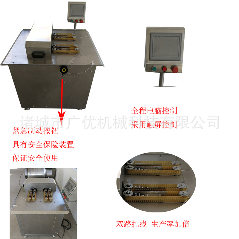 1.本机采用先进的触屏操作方法,产品长度可随意调节。一次实现结扎两根香肠。