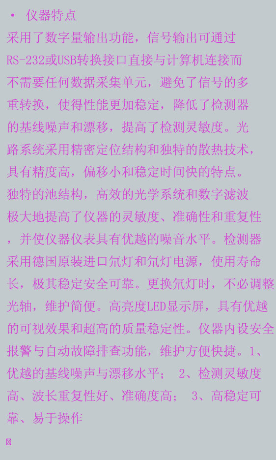2.2仪器的特点采用数字输出功能,信号输出可以通过RS-232或USB转换接口直接连接到计算机,而无需任何数据采集单元,避免了信号的多次转换,使性能越发稳定并减低了检测器的基线噪音和漂移提高了检测灵敏度。光路系统采用精确的定位结构和独特的散热技术,具有精度高,偏移小和稳定时间短的特点。独特的像元结构,高效的光学系统和数字滤波大大提高了仪器的灵敏度,准确性和重复性,使仪器具有优于的噪音程度。探测器采用德国进口的氘灯和氘灯电源,采用寿命长,极度稳定,安全精确。更换氘灯时无需调整光轴,容易维护。高亮度led显示屏,含有该仪器具有安全报警和自动故障排除功能,维护便捷快捷。1。不错的基线噪音和漂移水准;2.检测灵敏度高,波长重复性好,精度高;3.高稳定性,可靠性和易操作性。
