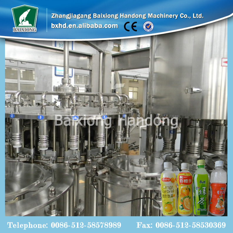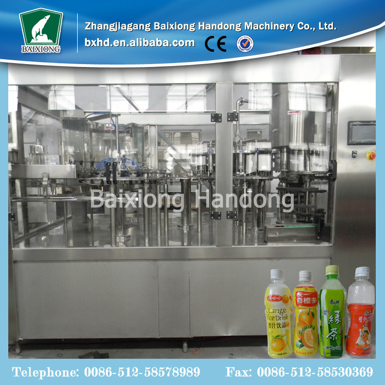 该机器将清洗,填充和封盖这三个功能结合在一起,整个过程是自动化的。适用于高温聚酯瓶灌装果汁饮料,果茶饮料,也适用于矿泉水,纯净水等。无气饮料,本机采用优质SUS304材质制成,主要零部件采用数控机床精细加工而成,整机采用先进的光电检测各部件的运行状况,无瓶无灌装,无瓶无盖,自动化程度高,人机界面操作方便。