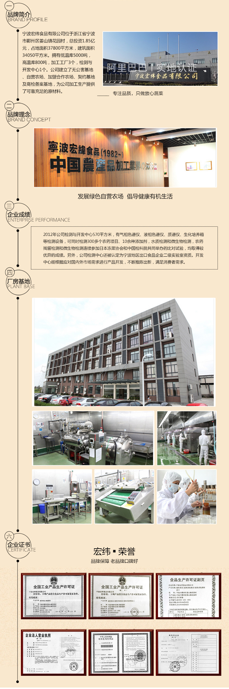 公司坐落浙江省宁波市鄞州区姜山镇花园村,总入股1.85亿元,占地面积37800平方米,建筑面积34050平方米,年生产能力5000吨。低温仓库,800吨高温仓库,3个加工厂,1个测试和开发中心。公司确立了无公害基地,自营农场,准许合作农场,合同基地和货品检验与备案基地,精确,充裕的原料供公司加工和生产。