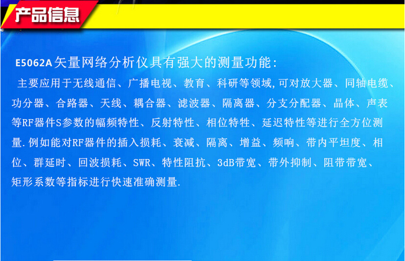 E5062A通用网络分析仪使用最新的现代技术,具容易使用的机能和平稳的性能,从而能够执行准确的基本S 参数测量