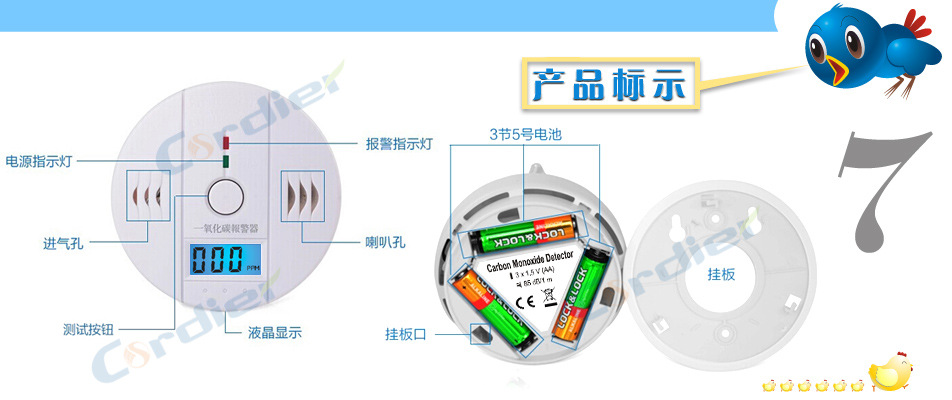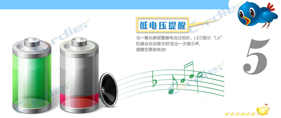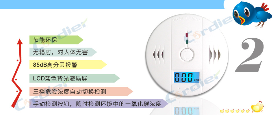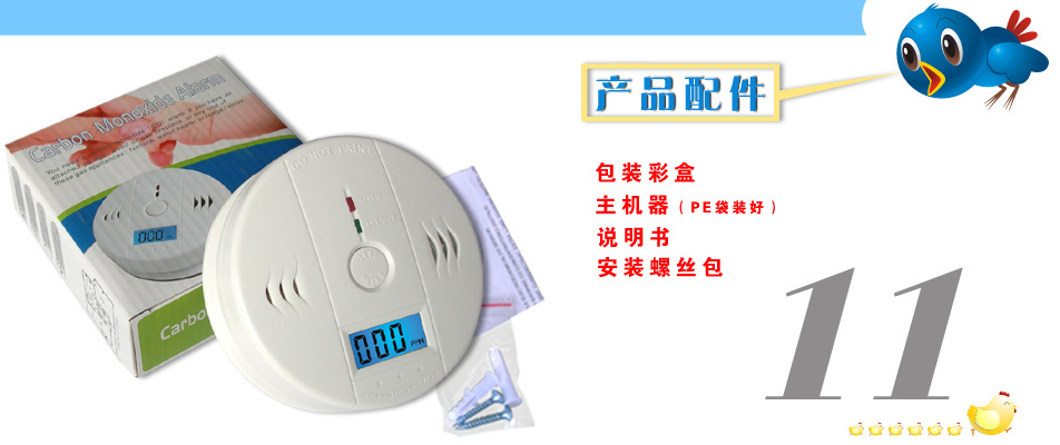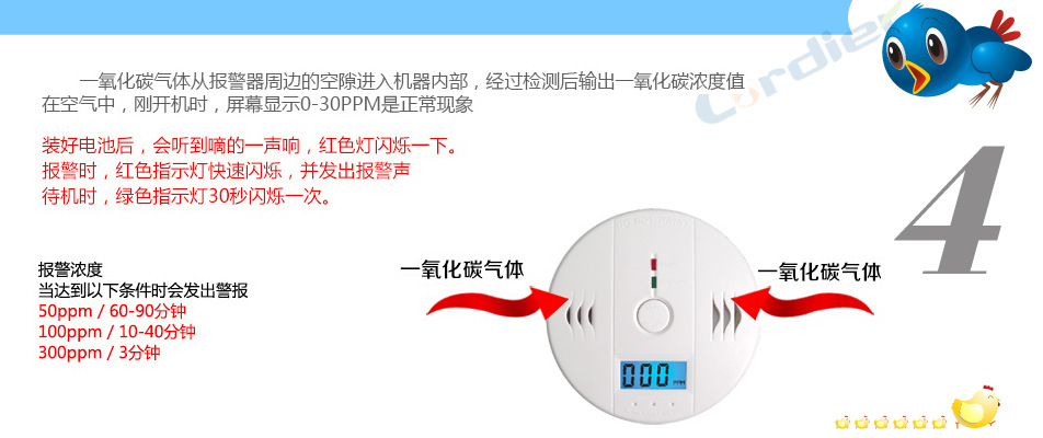 排气中的一氧化碳通过警报表面外壳和底部外壳之间的空隙进入感应室。为使空气正常流通,请勿将警报器安装在肮脏,多尘或油腻的地方。传感器使用电化学技术,对一氧化碳有着极高的灵敏度,可避免误报。蜂鸣器85分贝,声响使您忆起危险。一氧化碳警报的形式为:发出三声哔哔声,终止1秒,5秒,然后反复。