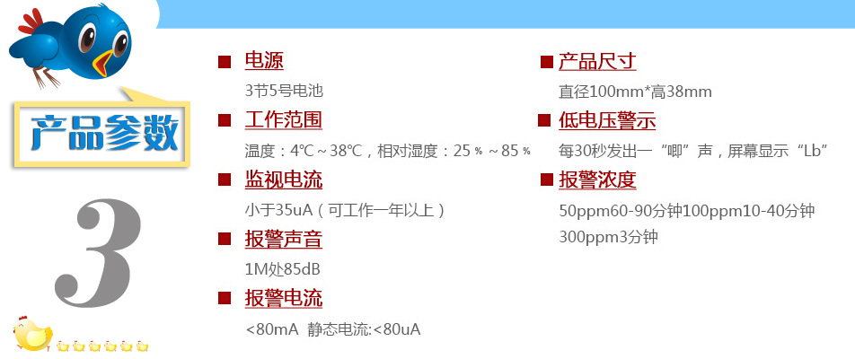 10.警报:高分贝警报声响为3m(>85db),频率约为3khz,红色led快速闪烁。