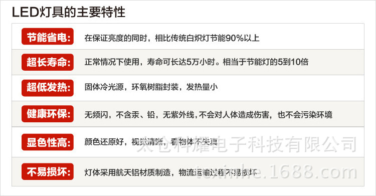 该产品节能高效,使用寿命漫长50,000小时,绿色环保,无重金属和有毒危害成份,无光辐射,直流驱动器无闪烁