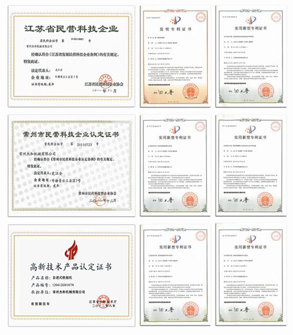自成立以来,常州杰和机械有限公司本着自主创新的精神上开发了多种高效产品,并赢得了一系列发明专利证书