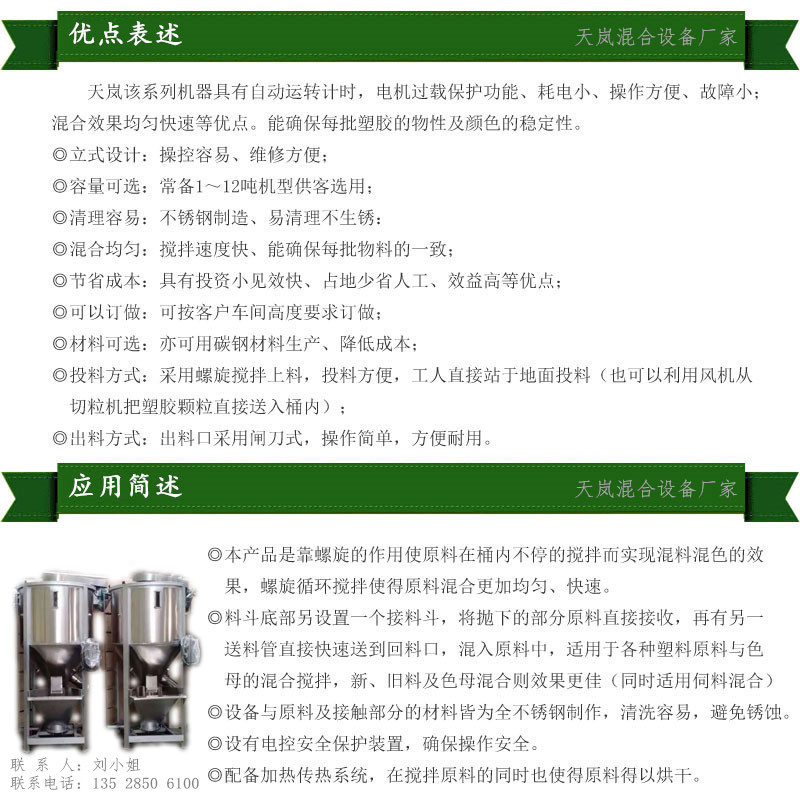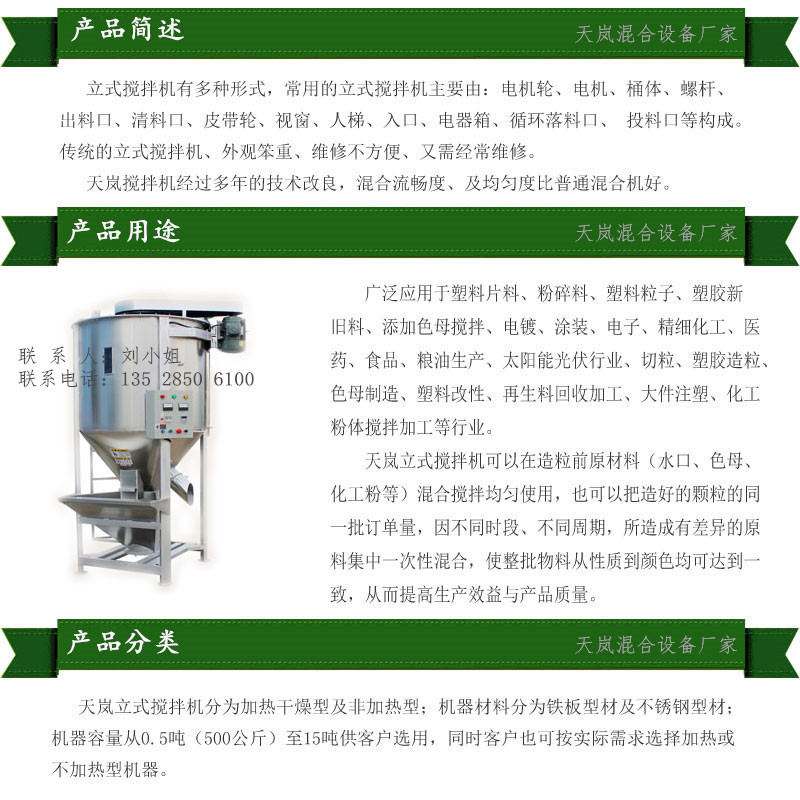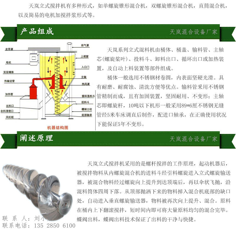 - 产品别名塑胶原料混料机,大型塑料混色机,螺旋搅拌机,立式拌料机,立式混合机等