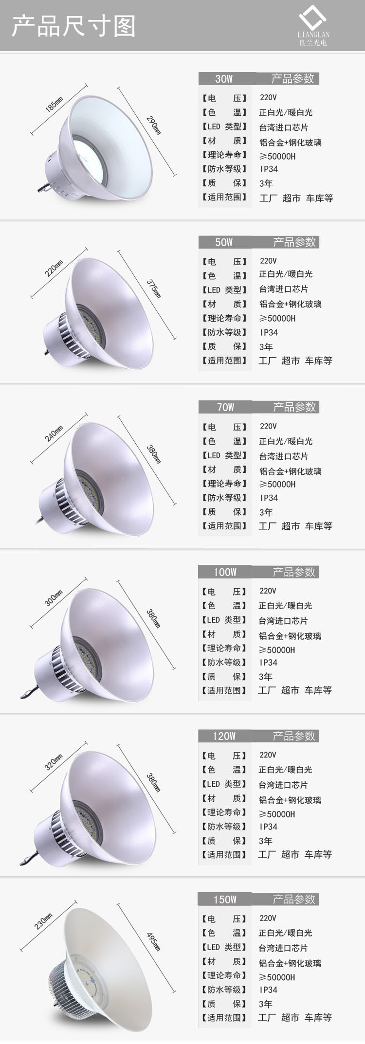 - 光束角30W,50W,70W,80W,100W,150W