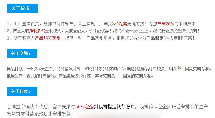 产品详情:弘迪雅克力厂是一家综合性企业,专门生产有机玻璃产品(丙烯酸,压克力),喷油喷砂,丝网印刷,激光雕刻,切割和其他有机工艺。工厂有各种有机玻璃。(亚克力,压克力)生产加工装置,计算机雕刻机,激光雕刻切割机等先进装置,配置了各种有机玻璃(亚克力,压克力)加工技术生产线,我们在有机玻璃(亚克力)方面,压克力)多年的技术经验和充沛的产品深加工经验。该工厂汇聚了一批在有机玻璃(丙烯酸,压克力)行业中服务多年的技术人员和工友。他们以技术为基本,以产品创新为指导,紧贴市场发展趋向,先进的生产装置,一流的客户服务和专业的技术人员使我们在同行领域处于领先地位,并为客户提供更多精巧奇特的有机玻璃(亚克力,压克力)产品。我们坚称以诚信为本,以更好的产品,更实惠的价钱,更快的交货期取得客户!热忱欢迎海内外朋友光临我厂用以指导,地形图处理和样品定购。热忱欢迎国内外客商光临接洽业务!