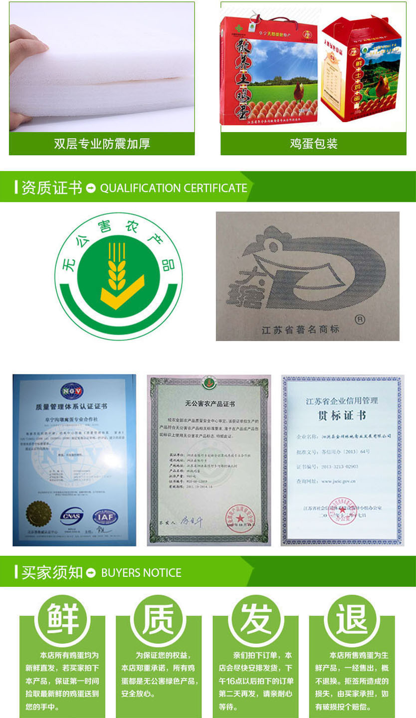 产品详情:“大塘”品牌土鸡蛋是在历史悠久的草鸡家乡-江苏省苏北地区阜宁县生产的,草鸡都是农民在传统阳光下自由放养的形式,在充分的阳光下发育,自然饲料不涵盖任何添加剂。“大塘”品牌土鸡蛋有着蛋白质强,蛋黄红,新鲜的味道和丰沛的营养素的特点。它是日常消费,节日宴会以及给亲戚的礼品的好产品。在2005年,国家农业部将其鉴定为无污染产品。该蛋白质已被全国许多大型杂货店选为专业精品店。近年来,在相关外贸机构经过多次检验后,也已出口到香港,澳门等地,并受到客户的青睐。
