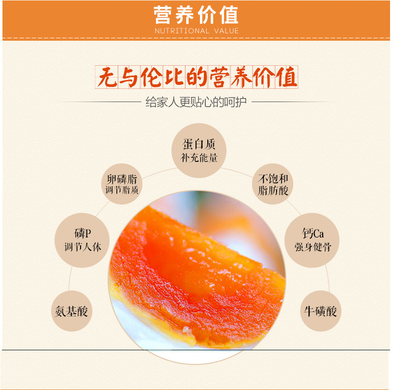 ●真空包装,保健简便,比新鲜蛋黄更容易贮存。