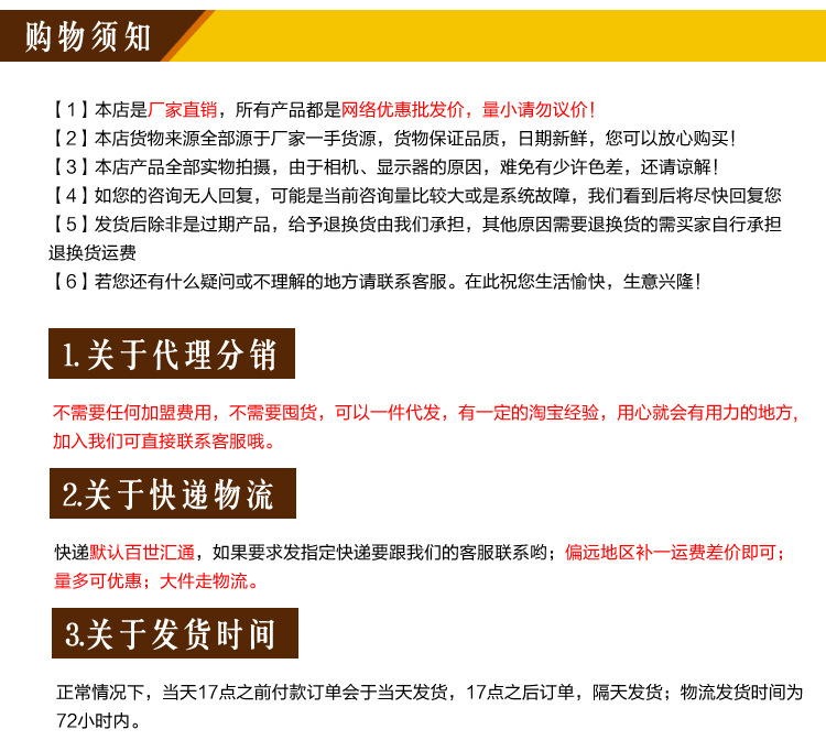 由于食物是盗窃的重灾区,因此在签收时请务必根据交货单检验货物。如果短缺或损坏,请回绝签收并拍照。请即刻与我们联系,我们将竭诚为您化解疑问。如果您不验证重量和数目,请签定,本公司不肩负任何义务。(签收后,不再发物流和快递肩负义务,我们店铺的盈利微薄,无法补救物流和快递的疏忽,一般而言很难在差评和退款之间做出选择,但应受到惩罚的人依然很大!期望购买者能了解,多谢)。