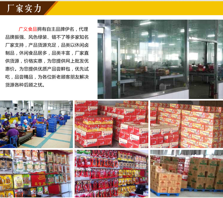 公司简介:长沙广义食品贸易有限公司成立于2015年6月,目前具备50多名高级技术人员和10多名有着5年以上经验的研发人员。该公司目前具备100多名职工,其年产量达到2000万人民币。公司自始至终秉承“企业生活来源于技术创新,产品质量来源于企业细节管理”的文化理念。在顺应湖湘新时代的经济发展过程中,我们自始至终坚称产品更新和产品详尽信息。不停尽力管理。长沙广义食品贸易有限公司是一家专业生产和加工休闲酱炖肉制品,休闲豆制品,休闲蛋制品和其他产品的公司。有着完整,科学的质量管理体系。诸如真强和cannot这类品牌直接来自制造商,而单独品牌为:伊名。长沙广义食品贸易有限公司的诚信,实力和产品质量已为业界所认定。欢迎各界朋友光临,指导和接洽业务。