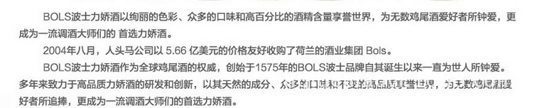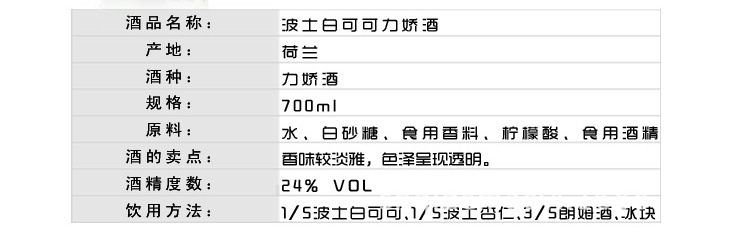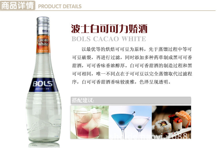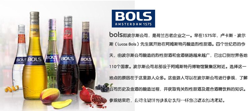 产品详情:波士力娇酒,由荷兰阿姆斯特丹产生,由荷兰人CucasBols于1575年创办。它采用来自世上各地的不同天然水果和香料来创设各种基于boss的产品和波士公司酒秘方世是一家历久不衰的家族企业。老板娘产品具多种口味和色调,调酒师须要打算鸡尾酒产品。